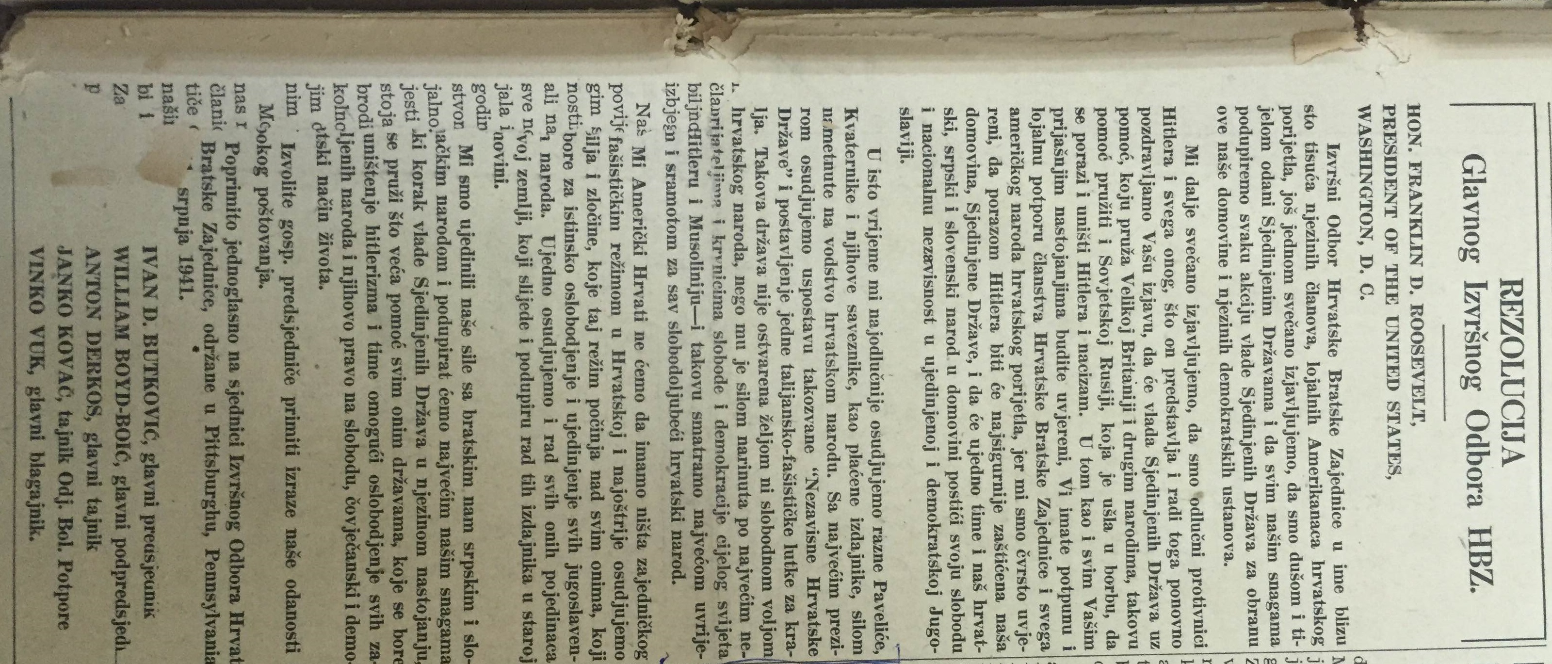 Mi dalje svečano izjavljujemo, da smo odlučni protivnici Hitlera i svega onog, što on predstavlja i radi toga ponovo pozdravljamo Vašu izjavu, da će vlada Sjedinjenih Država uz pomoć, koju pruža Velikoj Britaniji i drugim narodima, takovu pomoć pružiti i Sovjetskoj Rusiji, koja je ušla u borbu, da se porazi i uništi Hitlera i nacizam. U tom kao i u svim Vašim prijašnjim nastojanjima budite uvjereni, Vi imate potpunu i lojalnu potporu članstva Hrvatske bratske zajednice i svega američkog naroda hrvatskog porijetla, jer mi smo čvrsto uvjereni, da porazom Hitlera, biti će najsigurnije zaštićena naša domovina, Sjedinjene Države, i da će ujedno time naš hrvatski, srpski i slovenski narod postići svoju slobodu i nacionalnu nezavisnost u ujedinjenoj i demokratskoj Jugoslaviji.