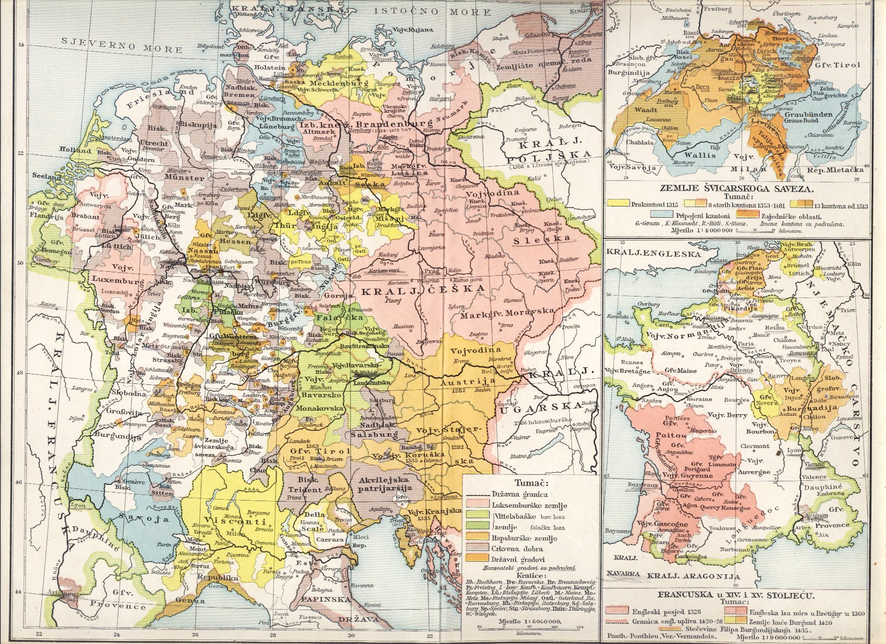 Njemačka i gornja Italija u 15. stoljeću (1477.). Bosna do propasti svoje (1463.).Vetinske zemlje 1485. Razdioba Njemačke na okružja.