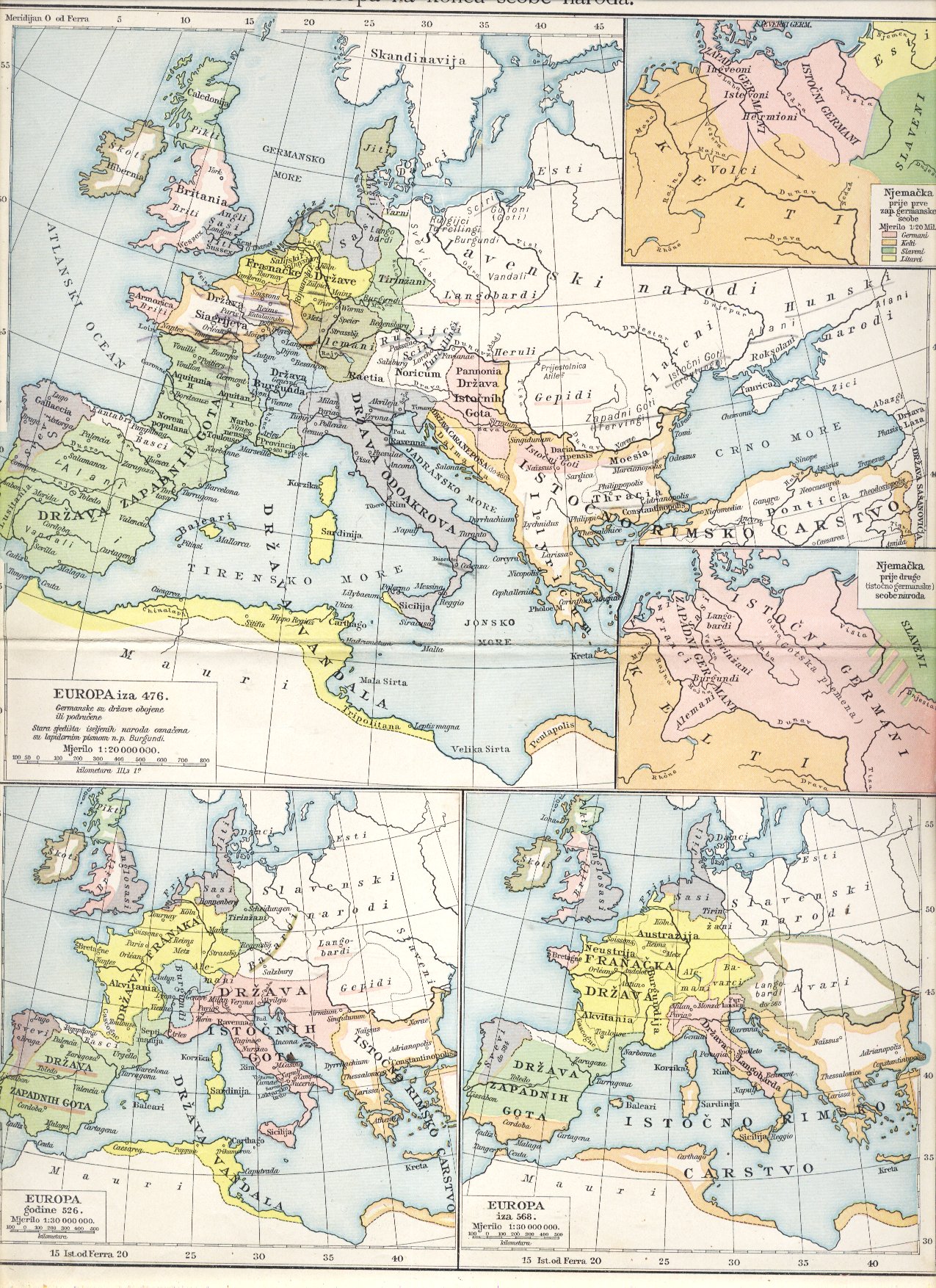 Evropa na koncu seobe naroda. Evropa iza 476. Evropa godine 526. Evropa iza 568. Njemačka prije prve seobe zapadnih Germana. Njemačka prije druge (istočno-germanske) seobe.