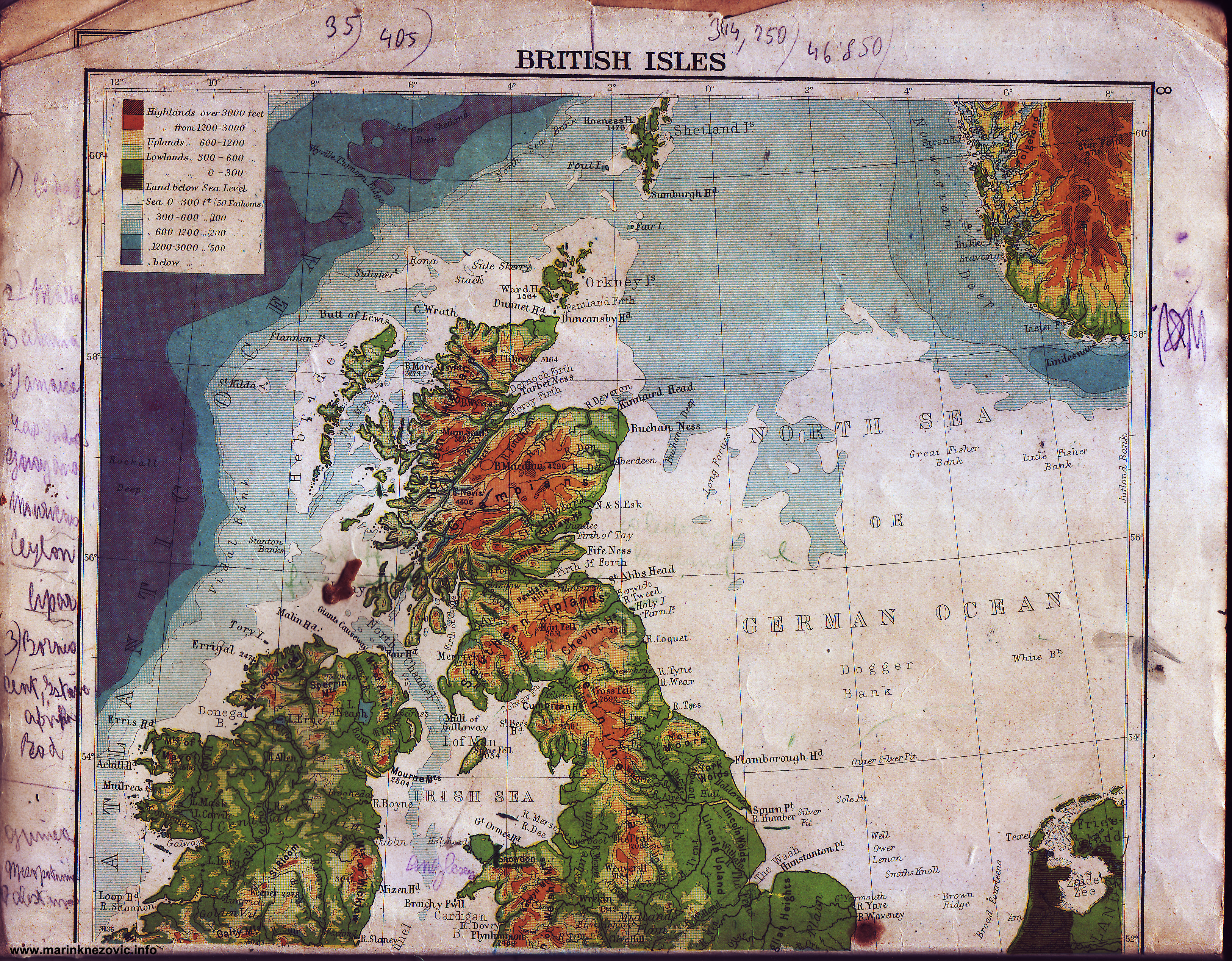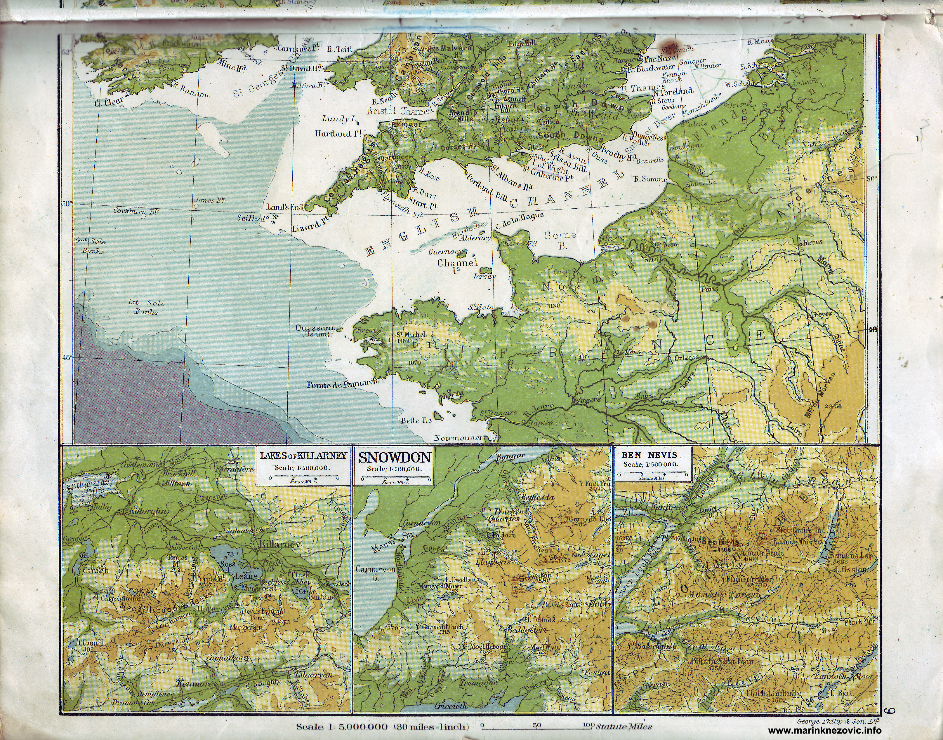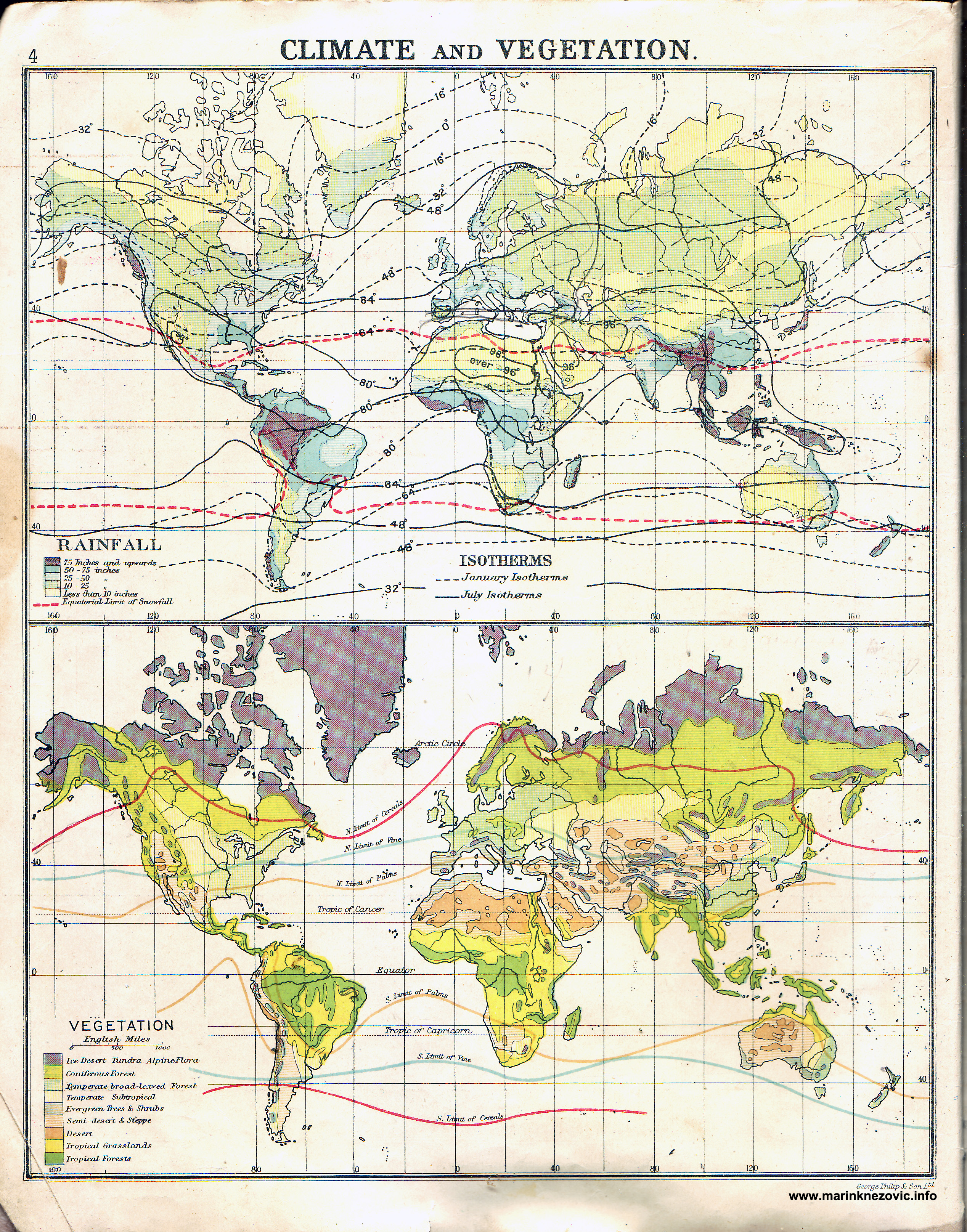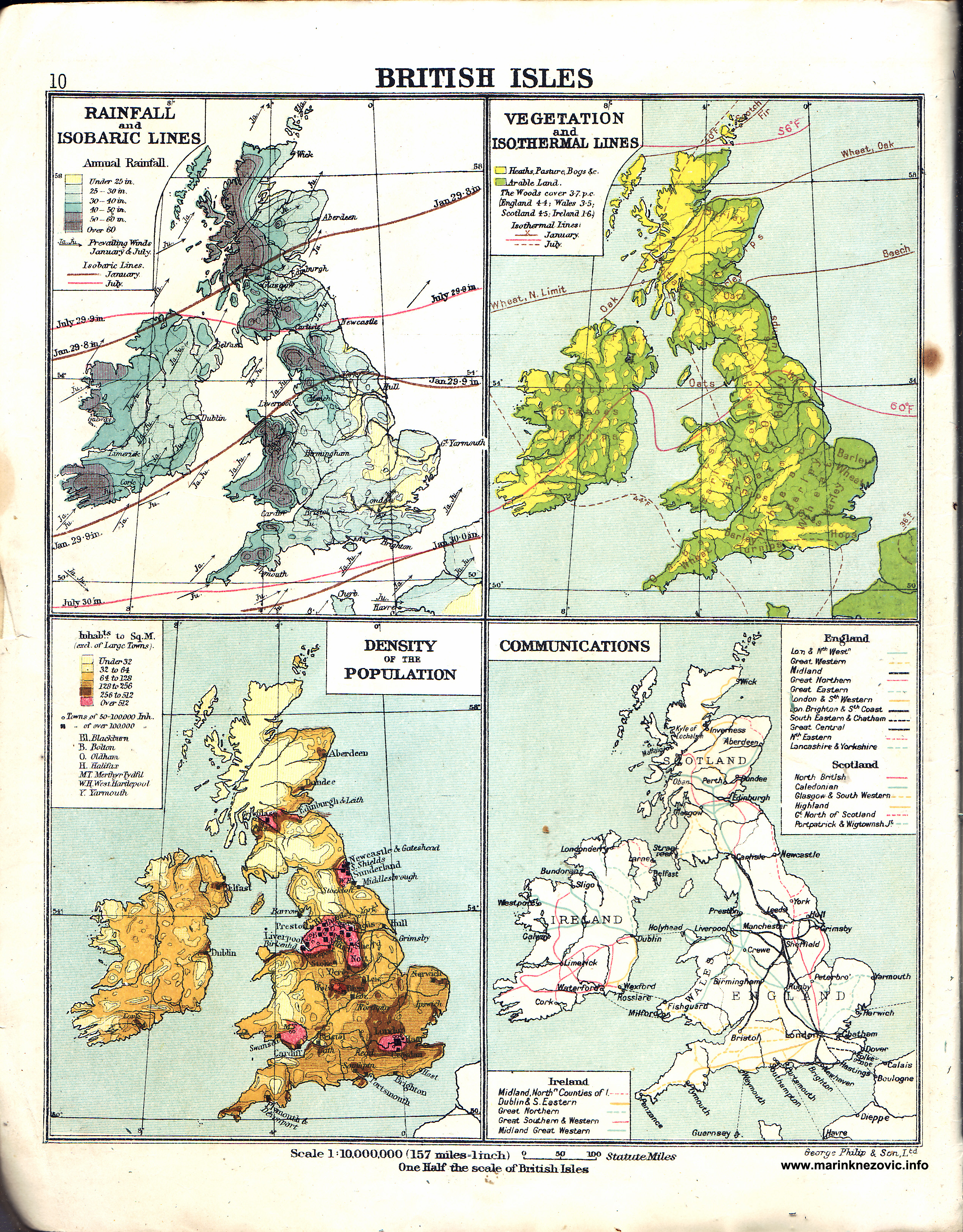 Britanski otoci, Linije padavina i isobara, Vegetacija i isotermalne linije, Gustoća stanovništva, Komunikacije / British Isles, Rainfall and isobaric lines, Vegetation and isothermal lines, Density of the Population, Communications.