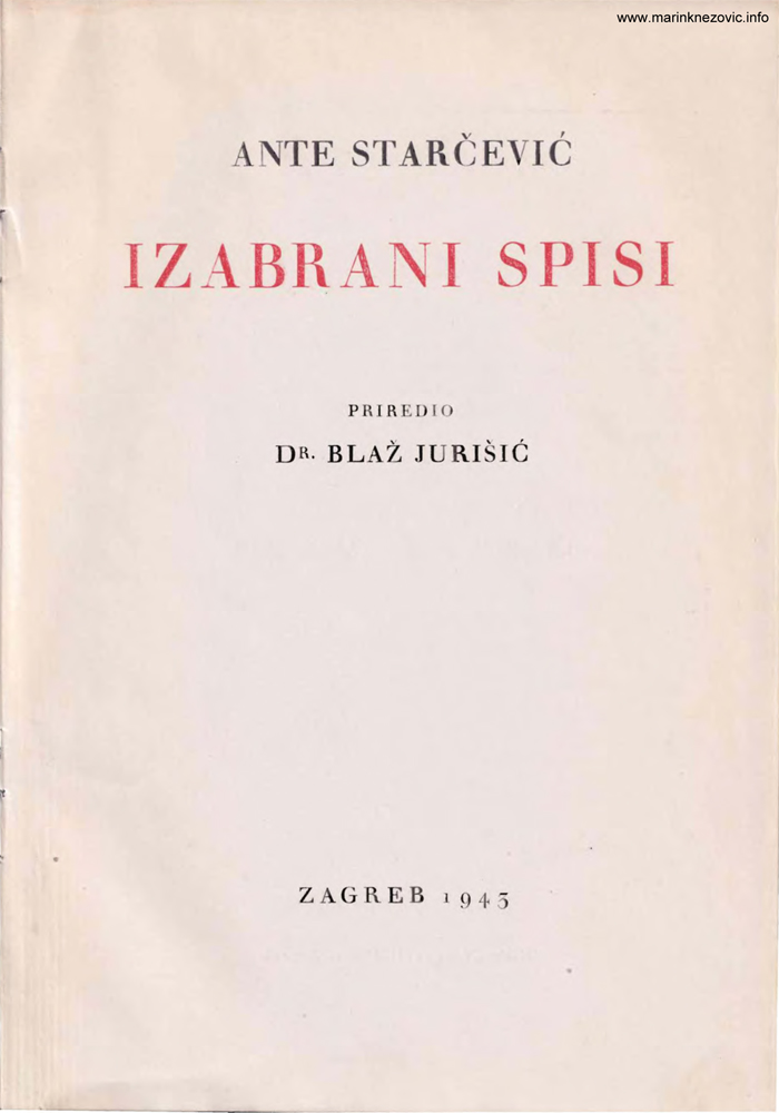 Ante Starčević, Izabrani spisi (priredio Blaž Jurišić), Zagreb 1943.