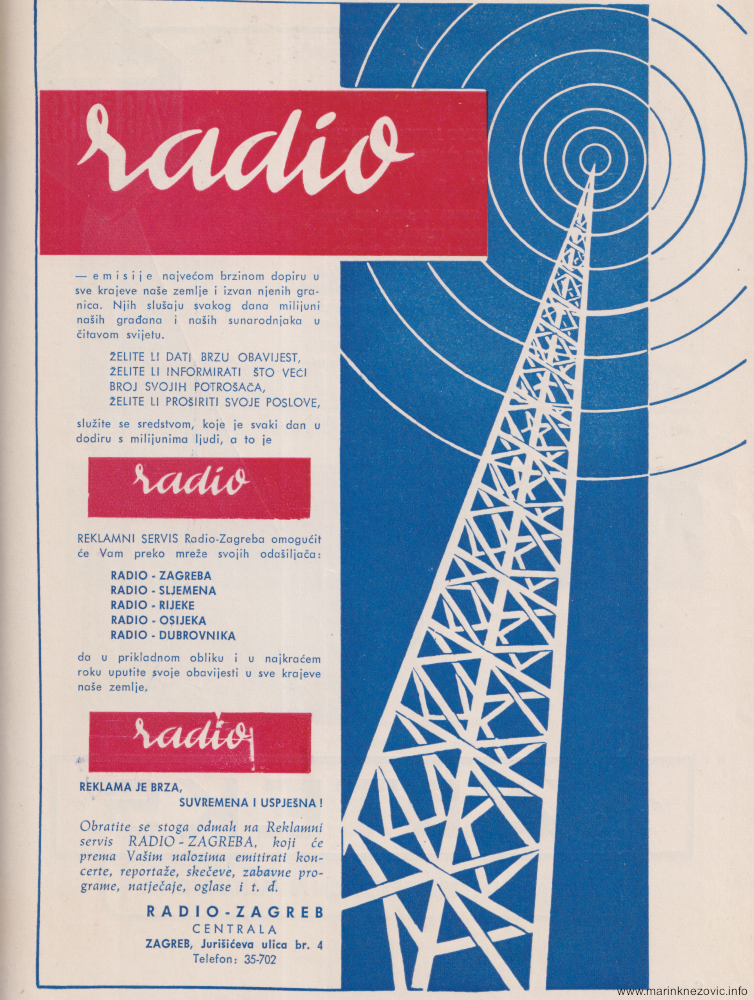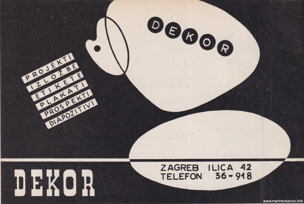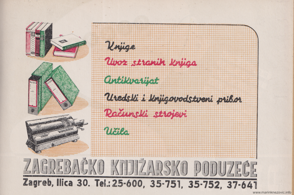 Reklama za Zagrebačko knjižarsko poduzećeReklama za VarteksReklama Tvornice duhana ZagrebReklama za radio ZagrebReklama za poduzeće PastorReklama za veletrgovačko poduzeće GričReklama za Gradsku automehaničku radionicu Zagreb Reklama za poduzeće DekorReklama za poduzeće Chromos